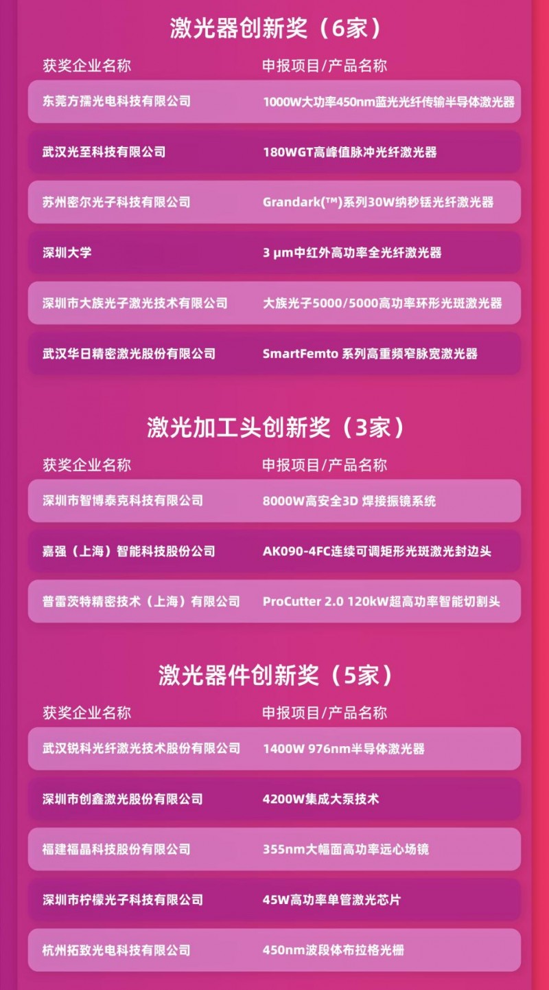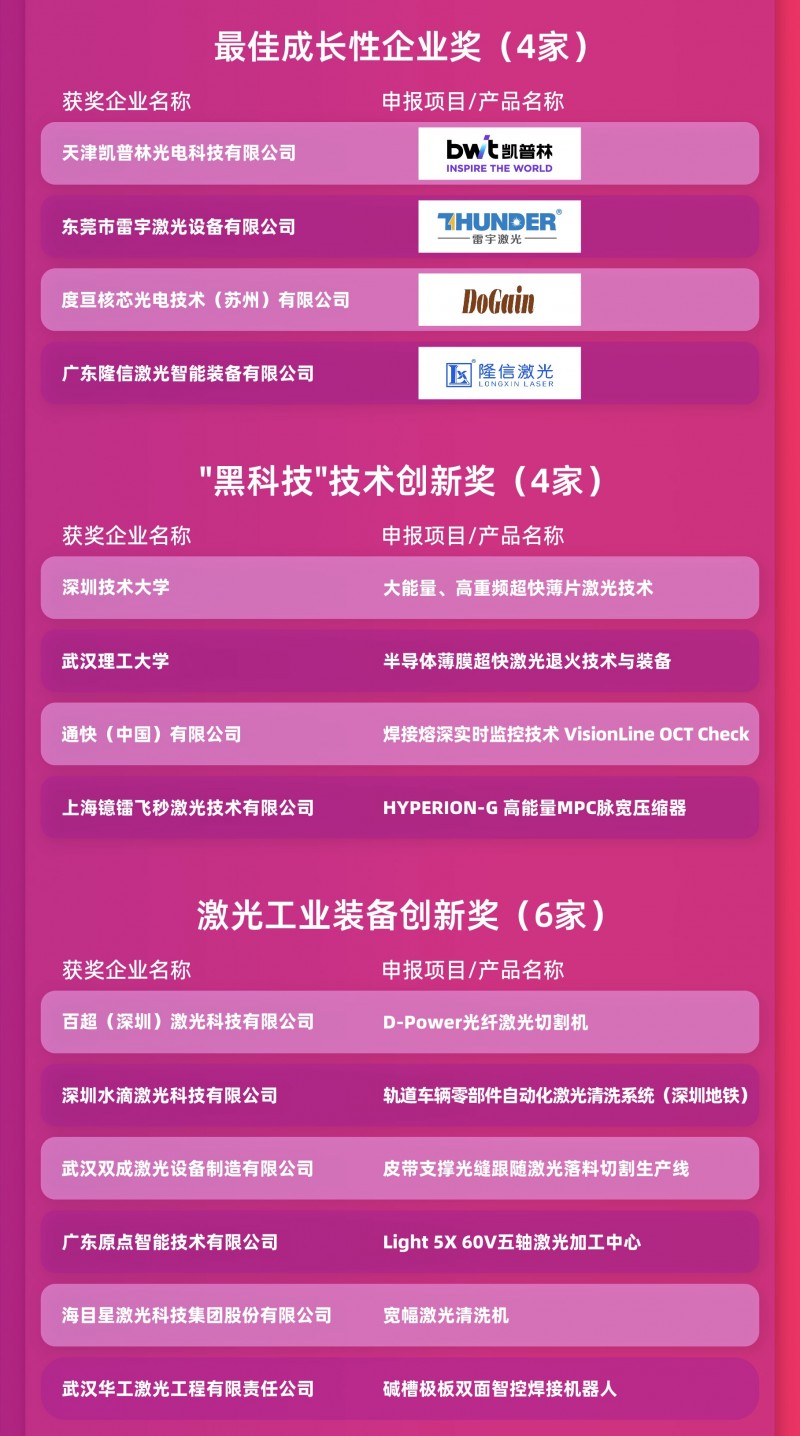 当晚揭晓的获奖名单中,大族激光科技产业集团、华工激光、通快(中国)、锐科激光、杰普特、海目星激光、福晶科技、凯普林、创鑫激光、阿帕奇、盛雄激光、柠檬光子、隆信激光、迅镭激光、特域机电、大族激光智能装备、光至科技、岗春激光、海天激光、华日激光、百超迪能、水滴激光、长盈通光电、中科光智、思特光学、拓致光电、智博泰克、上海嘉强、普雷茨特、方孺光电、密尔光子、大族光子、双成激光、原点智能、镱镭飞秒激光、雷宇激光、度亘核芯等众多知名激光企业和深圳大学、深圳技术大学、武汉理工大学等高校机构赫然在列。获奖对象包含激光器件、激光器、激光工业装备、激光加工头等激光全产业链的引领者,覆盖湖北、广东、江苏、浙江、山东、北京、上海、重庆等主要激光产业分布区域。