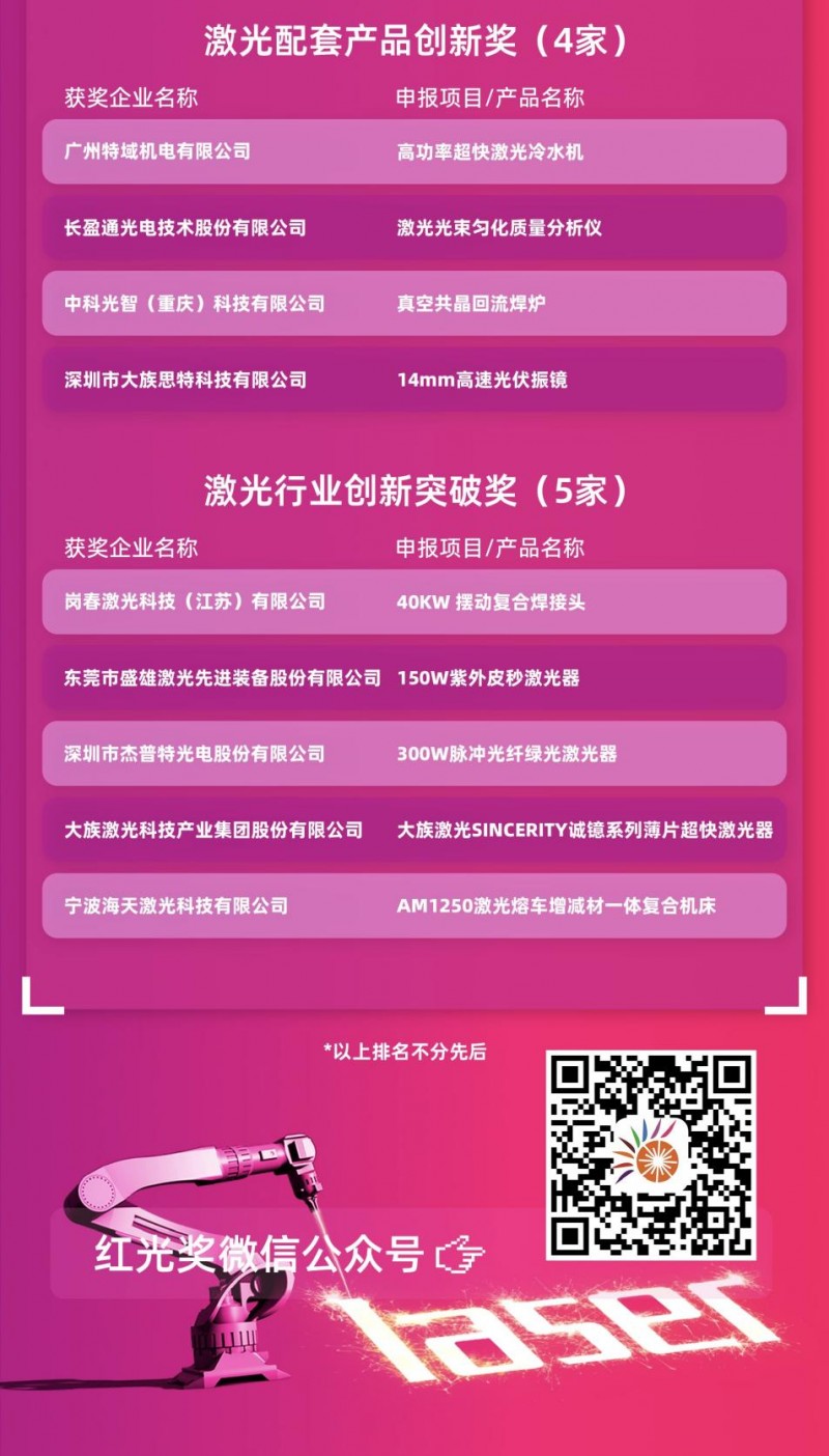 据“红光奖”组委会介绍,“红光奖”评选活动自2018年启动以来,已累计发现和推荐相关引领性激光产品、技术和成果300余项,在挖掘激光新技术、推广新产品、鼓励技术创新方面发挥了积极作用,在激光行业业界具有广泛的影响力。未来将继续发掘和彰显中国激光产业的优秀企业和创新力量,顺应激光行业发展新趋势,通过“红光奖”活动打通激光行业壁垒,打造更具专业度和影响力的行业奖项,增强获奖项目在激光制造全领域的影响力。
